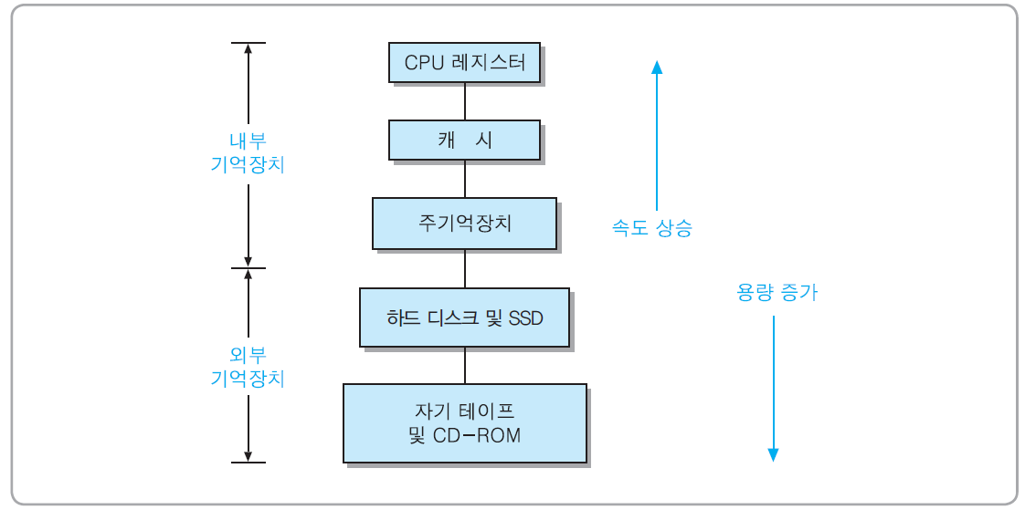 - 속도, 가격 및 크기가 다양한 기억장치들을 계층적으로설치함으로써 성능대 가격비(performance/costratio)를 높이는 시스템 구성 방식