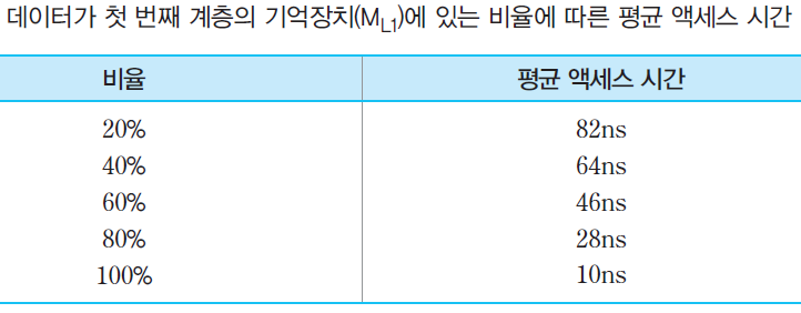 - 원하는 데이터가 첫 번째 계층의 기억장치에 있는 비율이 높아질수록 평균 액세스 시간이 그 기억장치의 액세스 시간에 접근하게 되어, 두 가지 유형의 기억장치들을 계층적으로 사용한 효과를 더 크게 얻을 수 있다.