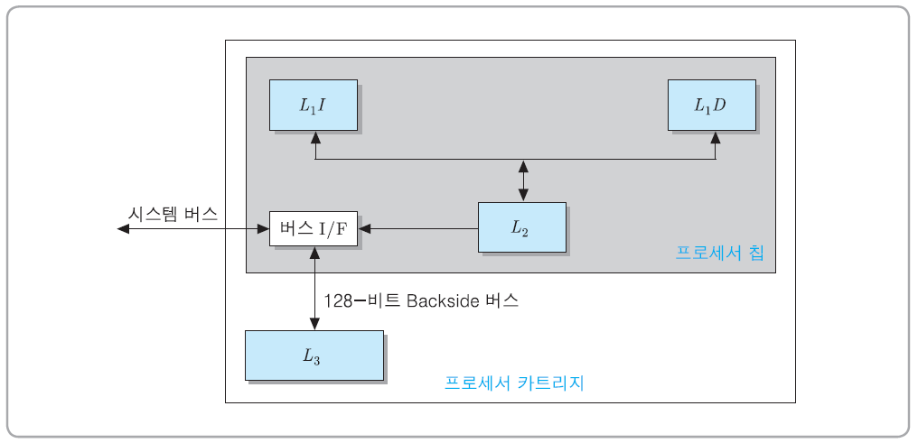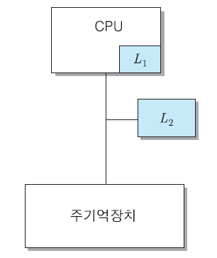 - 온-칩 캐시를 1차(L1) 캐시로 사용하고, 칩 외부에 더 큰 용량의 2차 (L2) 캐시를 설치하는 방식