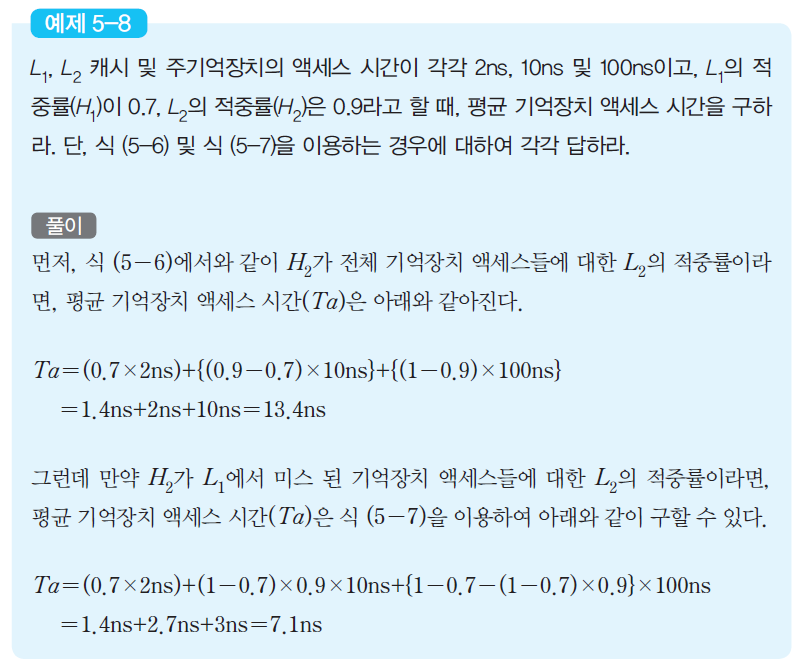 - Write-back 정책의 경우 : 읽기 동작과 쓰기 동작에 같은 시간이 걸리므로, 평균 기억장치 액세스 시간 = 0.9 x 10ns + 0.1 x (100ns + 0.2 x 100ns) = 21ns