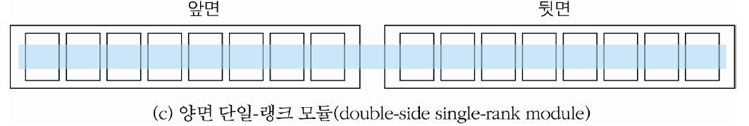 - 반면 양면 모듈에서는 기판의 양쪽 면에 칩들이 장착되며, 접속 핀들도 양면의 하단에 각가 설치되기 때문에 더 많은 수의 신호들을 입출력할 수 있다.