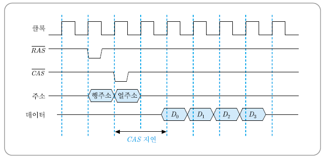 - CAS 신호와 열 주소가 인가되는 순간부터 데이터가 인출되어 버스에 실릴 때까지의 시간을 CAS 지연(CAS latency)라고 하는데, 일반적으로 두 클록 정도이다.