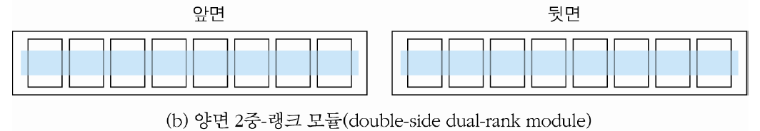 - 양면 모듈(DIMM)에서, x8 조직의 SDRAM들을 각 면에 8개씩 병렬 접속 하여 두 개의 랭크를 구성한 기억장치 모듈