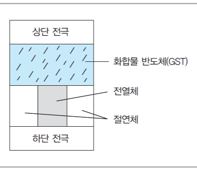 - PRAM의 각 메모리 셀은 두 개의 전극 사이에 화합물 반도체와 전열체(heater)를 삽입시킨 형태로 제조된다.