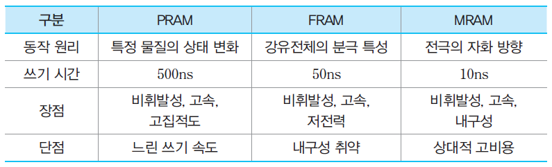 - 이들은 비휘발성의 특징을 가지면서도 플래시 메모리에 비하여 액세스 속도가 1000배 정도 더 빠르다.