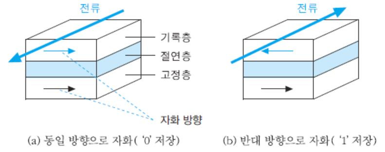 그러나 자화 방향이 서로 반대가 된다면, 저항이 커져 전류가 흐르지 않으므로 상하부 층간의 전위치가 높아져서 '1'로 인식된다.