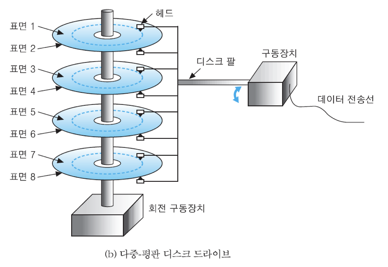 - 양면 디스크 드라이브에는 각 디스크 표면 당 한 개씩의 디스크 팔과 헤드가 존재한다.