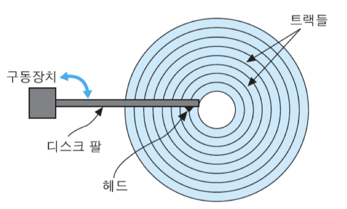 - 헤드는 디스크에 저장된 데이터를 읽을 때도 사용된다. 디스크의 표면에는 여러 개의 동심원들이 존재하는데, 이 원들을 트랙(track)이라고 부른다.