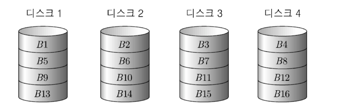 ex)네 개의 디스크들로 구성된 디스크 배열에 16개의 블록들로 이루어진 파일을 저장한다고 가정하면, 그 경우에 데이터 블록 B1은 첫 번째 디스크에 저장하고, B2, B3, B4는 순서대로 다음 디스크들에 저장한다.