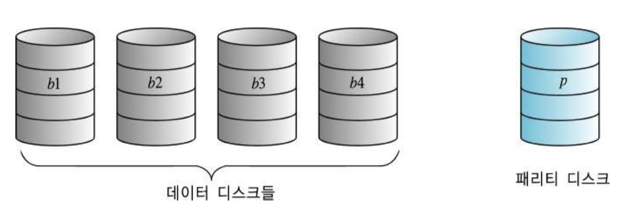 - 패리티 디스크를 한 개 추가하여 다른 디스크들에 저장된 데이터 블록에 대한 패리티 블록을 저장한다.