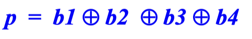 - 네 개의 디스크들과 한 개의 패리티 디스크로 구성된 조직에서 오류가 정정되는 과정을 보면 데이터 디스크에 저장된 비트들을 각각 b1, b2, b3, b4라 하면, 패리티 비트 p는 다음과 같이 계산할 수 있다.