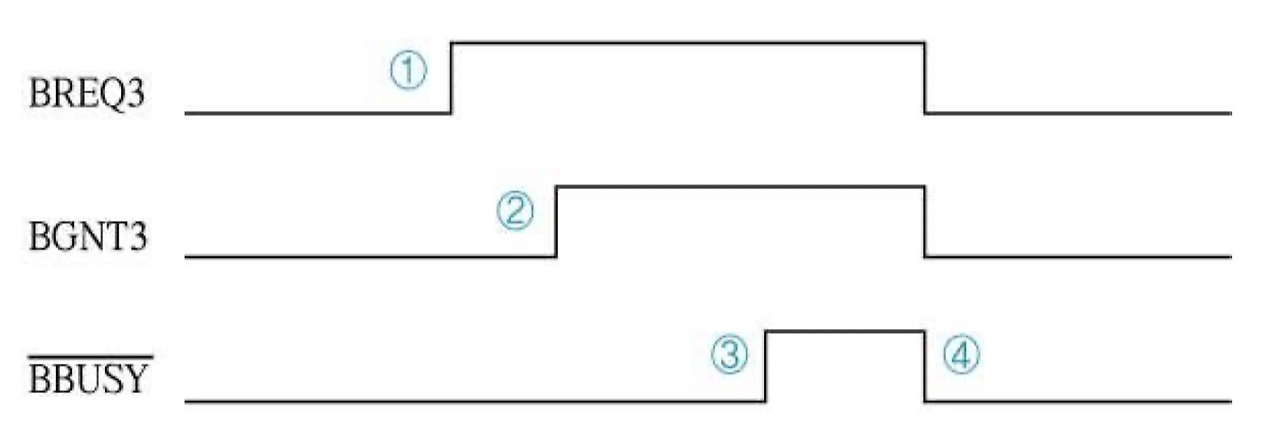 - 마스터 3이 BBUSY 신호를 다시 세트하고 버스 사용을 시작한다. 이때 BREQ3와 BGNT3는 제거된다.