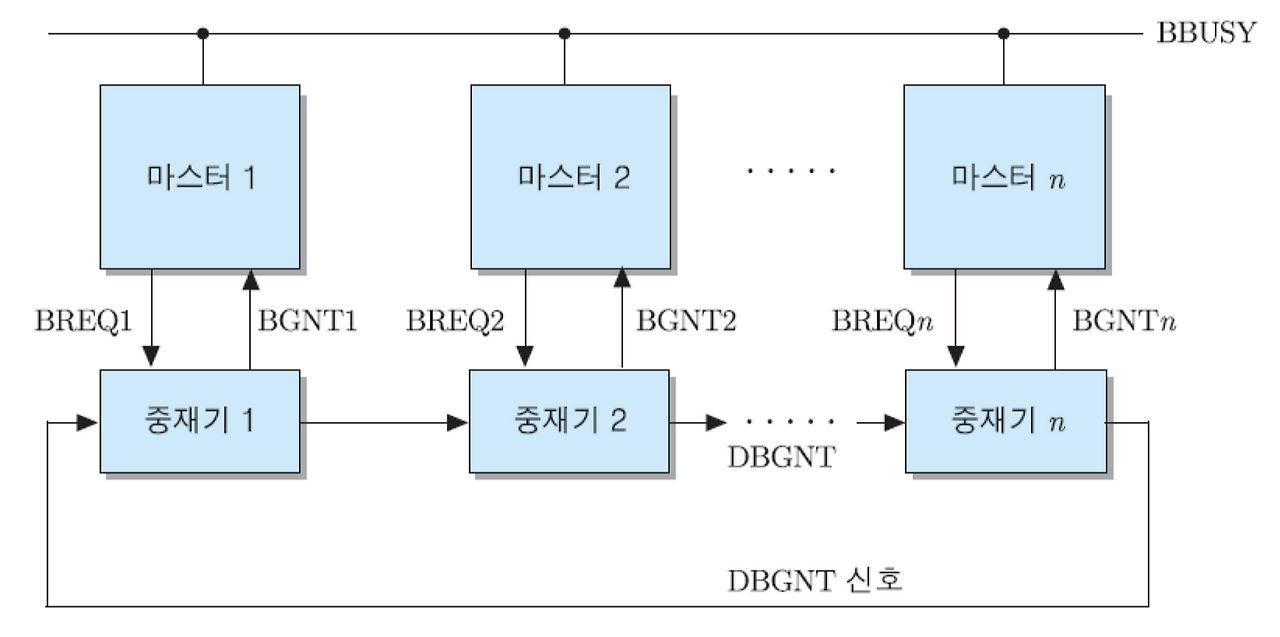 버스요구 신호와 버스승인 신호가 하나씩 있으며, 각 신호 선이 모든 버스 마스터들 간에 직렬로 접속되는 방식