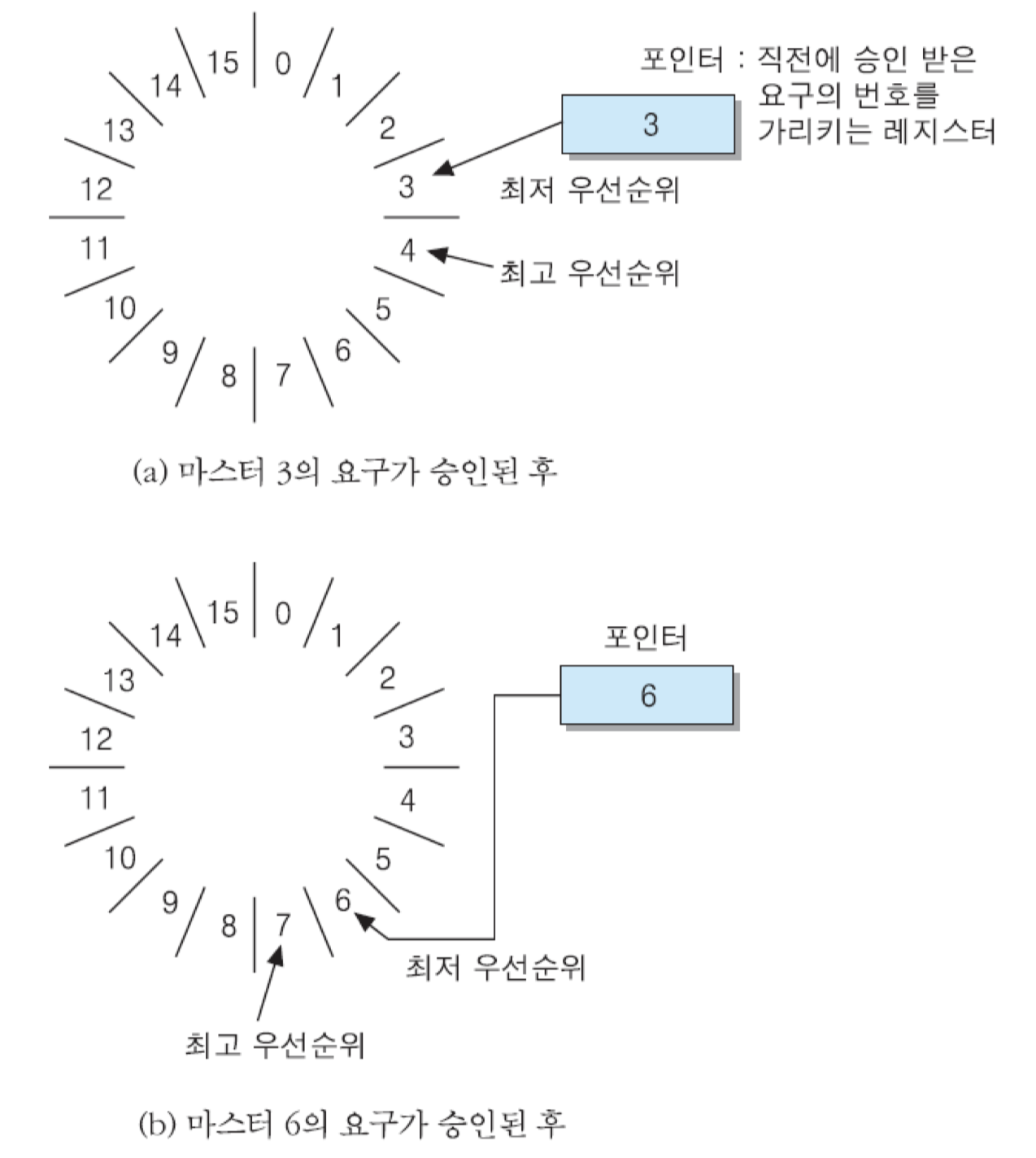 여기서는 어떤 마스터가 버스 중재깅에 의하여 버스 승인을 받게 되며, 포인터(pointer)는 그 마스터의 번호를 가리키게 되며, 그 다음 번호를 가진 마스터에게 다음 중재 사이클에서 최상위 우선순위가 주어진다.