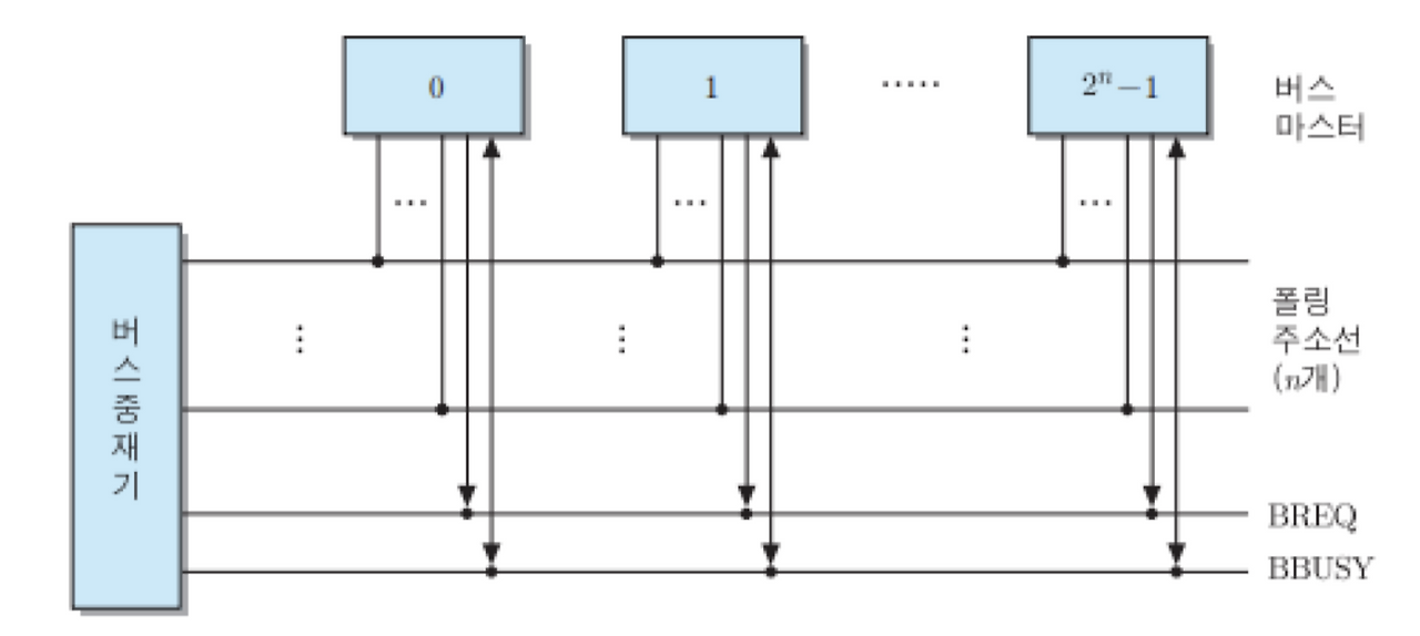- 이 방식에서는 버스 중재기와 버스 마스터 사이에 폴링 동작을 위한 별도의 폴링 선이 존재한다. 따라서 N개의 마스터를 가진 시스템에는 N개의 폴링 선들이 필요하다.