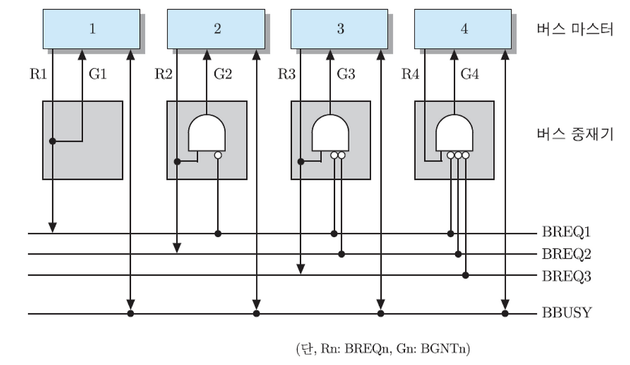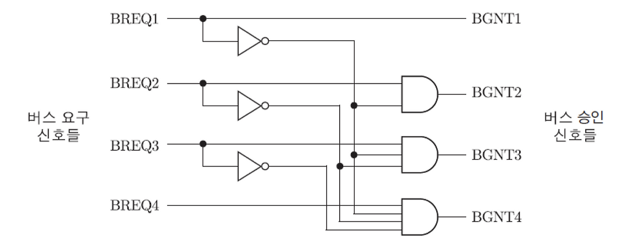 - 각 버스 마스터의 중재기는 자신보다 더 높은 우선순위를 가진 버스 마스터들의 버스 요구 신호들을 입력으로 받아서 검사하고, 그들 중의 어느 것도 버스 사용 요구를 하지 않은 경우에만 자신의 버스 승인 신호를 세트한다.