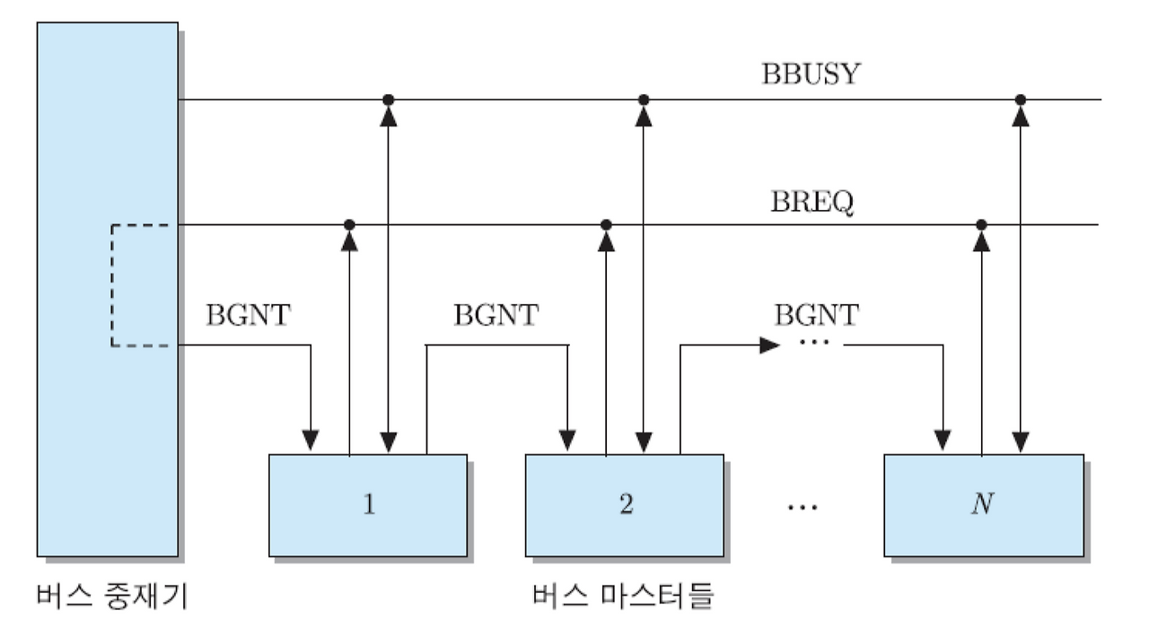 버스요구 신호와 버스승인 신호가 하나씩 있으며, 각 신호 선이 모든 버스 마스터들 간에 직렬로 접속되는 방식