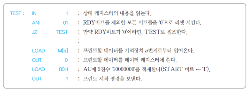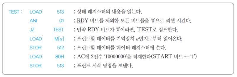 기억장치-사상 I/O 방식을 이용한 프린트 제어 프로그램의 예 - 데이터 레지스터 주소 = 512번지상태 레지스터 최하위 비트 = RDY 비트로 사용