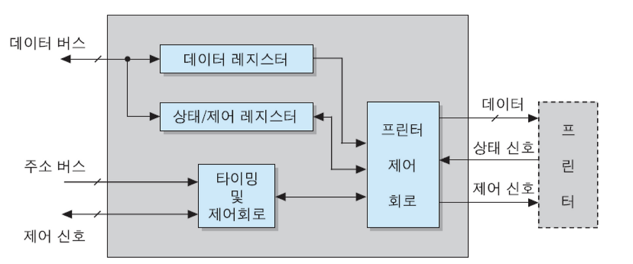 - 상태/제어 레지스터는 내부적으로 두 개의 상태와 오류 검사 결과 등을 나타내는 비트들로 구성되어 있어서, CPU가 프린터으 ㅣ상태를 검사할 때는 그 주소를 이용하여 상태 레지스터의 내용을 읽게 된다.
