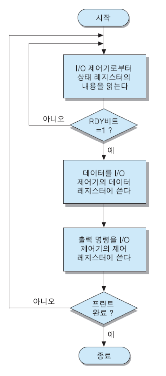 - CPU가 반복적으로 I/O 장치의 상태를 검사하면서 I/O 동작을 처리하는 방식을 '프로그램을 이용한 I/O' 혹은 '프로그램된 I/O'라고 부른다.