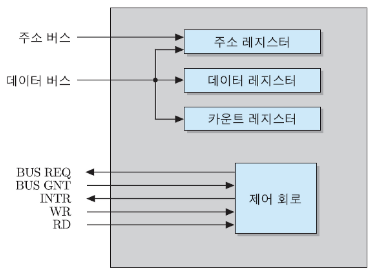 - CPU 개입 없이 I/O 장치와 기억장치 간의 데이터 전송을 수행하는 DMA 동작을 지원하는 하드웨어 모듈이다.