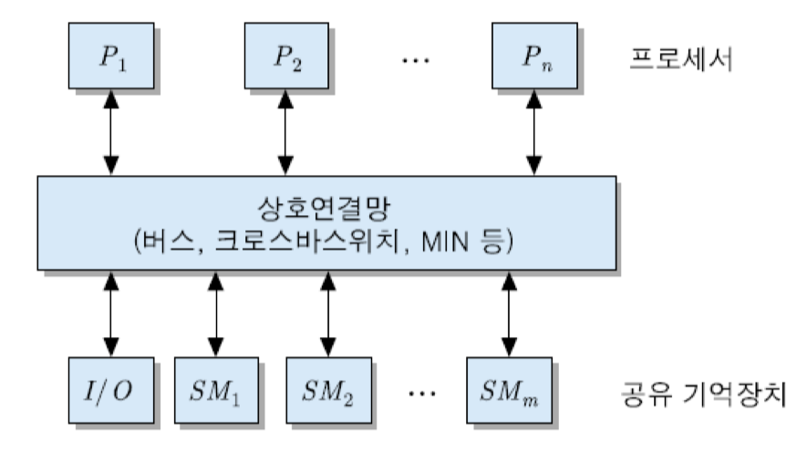 - 모든 프로세서들이 상호 연결망에 의해 접속된 기억장치들을 공유한다. 그리고 프로세서들은 기억장치의 어느 영역이든 액세스할 수 있으며, 그에 걸리는 시간이 모두 동일하다.