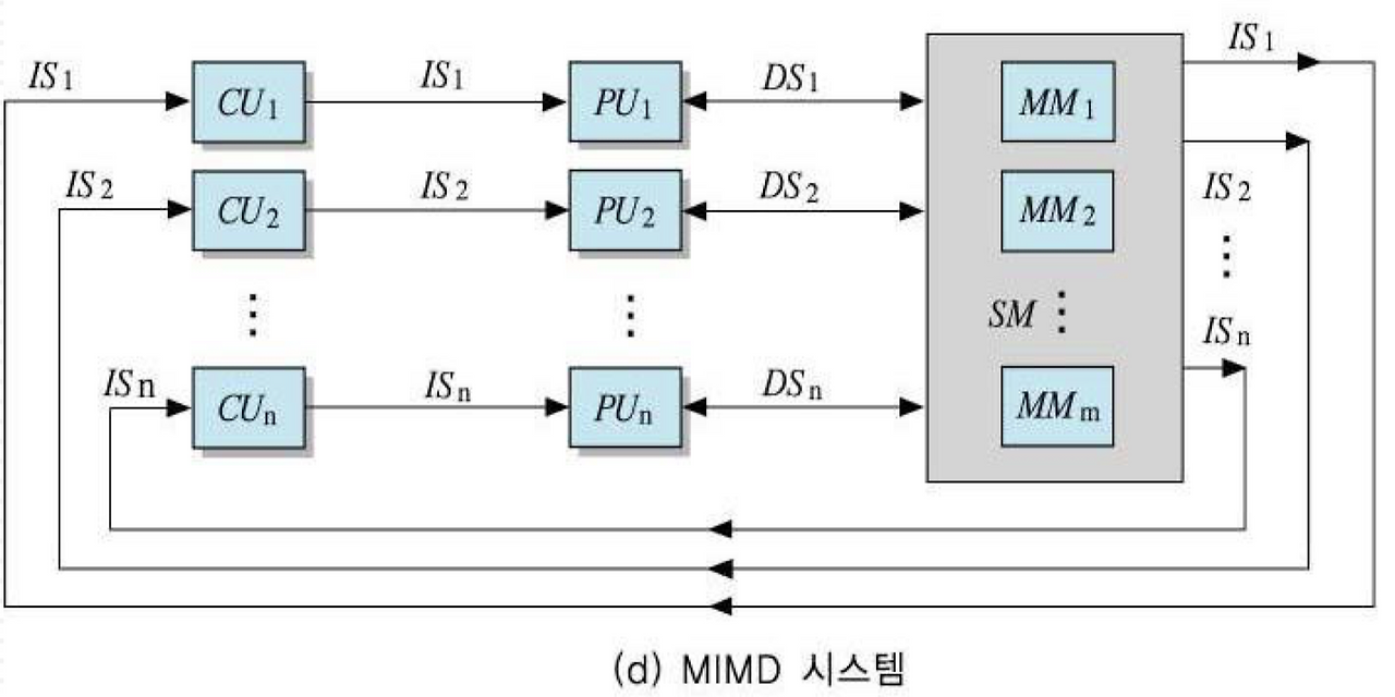 - 이 조직에서는 N개의 프로세서들이 서로 다른 명령어들과 데이터들을 처리한다.