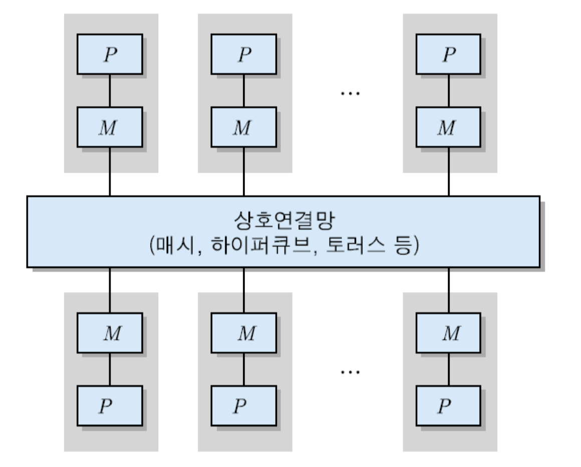 - 각 노드가 별도의 기억장치를 가지고 있기 때문에 분산-기억장치 시스템(distributed-memory system)이라고도 부른다.