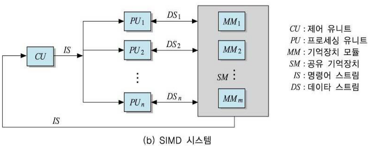 - 이러한 시스템은 여러 개의 프로세싱 유니트(Processing unit : PU)들로 구성되고, PU들의 동작은 모두 하나의 제어 유니트에 의해 통제된다. 제어 유니트는 명령어를 해독하고, 그 실행을 위한 제어 신호를 모든 PU들로 동시에 보낸다. 그에 따라 PU들은 동일한 연산을 수행하게 되지만, 각 연산에서 처리하는 데이터는 서로 다르다.