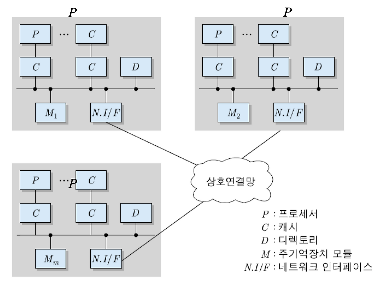 - 즉, 각 노드는 주기억장치를 공유하는 여러 개의 프로세서들을 포함하고 있으며, 각 프로세서는 캐시를 가지고 있다.