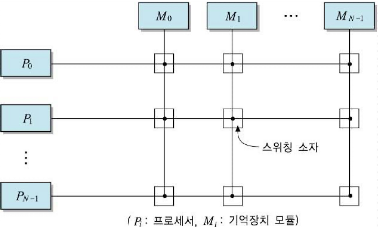 - 프로세서의 수가 많은 시스템에서는 버스 병목 현상을 줄이기 하여 높은 연결성을 제공하는 상호연결망 구조가 사용된다.