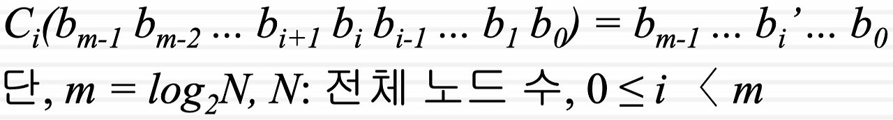 - 이 경우에는 전체 노드의 수가 2의 4승 = 16이므로, 노드 번호는 4비트로 이루어짐. 따라서 식의 함수로부터 C3(b3b2b1b0) = b3b3b2b1b0를 구할 수 있으며, 노드 번호의 최상위 비트인 b3의 값이 서로 다른 노드들을 서로 접속하면 된다는 것을 알 수 있다.