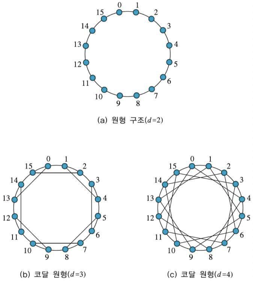 - 이러한 변형된 구조를 코달 링(chordal ring) 구조라고 부르며, 링크의 수가 증가될 수록 네트워크 지름은 감소된다.