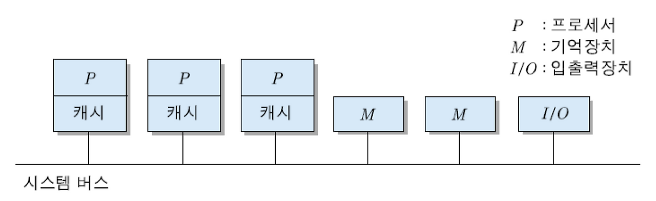 - 이에 따른 성능 저하를 보완하기 위해 버스의 전송 속도를 높이거나 각 프로세서가 캐시를 가지도록 하는 방법이 사용되고 있다.