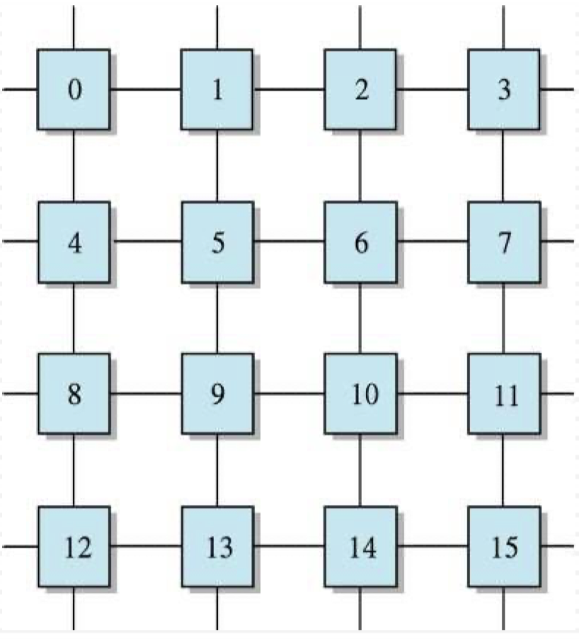 - 4x4 매시 네트워크의 기본 구조이며, 이 구조는 Illiac IV, MPP, DAP, CM-2 및 Intel Paragon같은 병렬컴퓨터들에서 실제로 사용되는데, 이 시스템들에서는 연결성을 높이기 위하여 기본 구조에 약간씩의 링크들을 추가하였다.