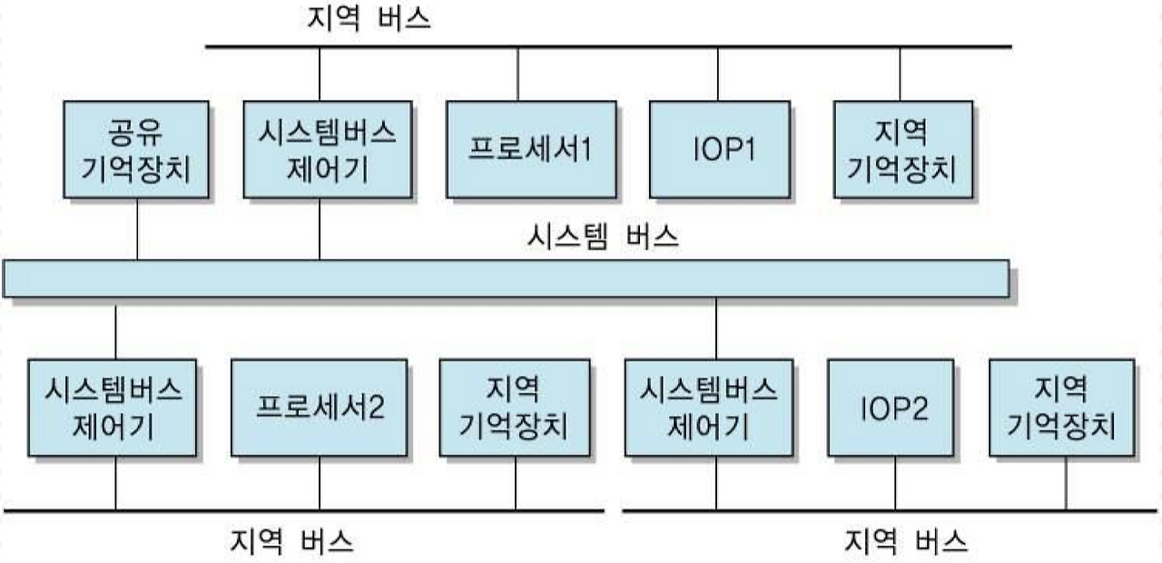 - 각 프로세서가 자신의 지역 기억장치 및 I/O 프로세서와 연결되는 지역 버스를 가직 ㅗ있고, 공유 기억장치를 사용할 때만 시스템 버스를 사용하는 계층적 버스 구조를 보여준다.