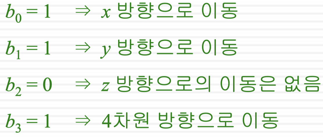 - 방향 단어의 LSB부터 검사하여, 비트 값이 1이면 x방향으로 이동하고 0이면 이동하지 않는다.