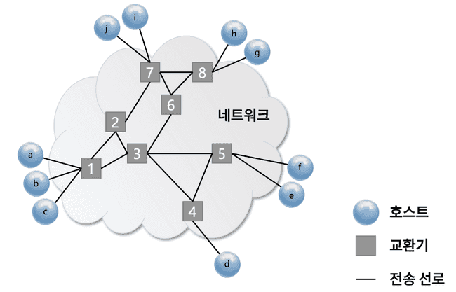 교환 회선 방식을 이용해 주고 받으려면 중간에 위치한 교환 시스템의 중개가 필요하다. 뭉게구름 안에 있는 교환기와 전송 선로들은 바깥에 있는 호스트들이 데이터를 송수신하기 위해 공유하는 자원이다.
