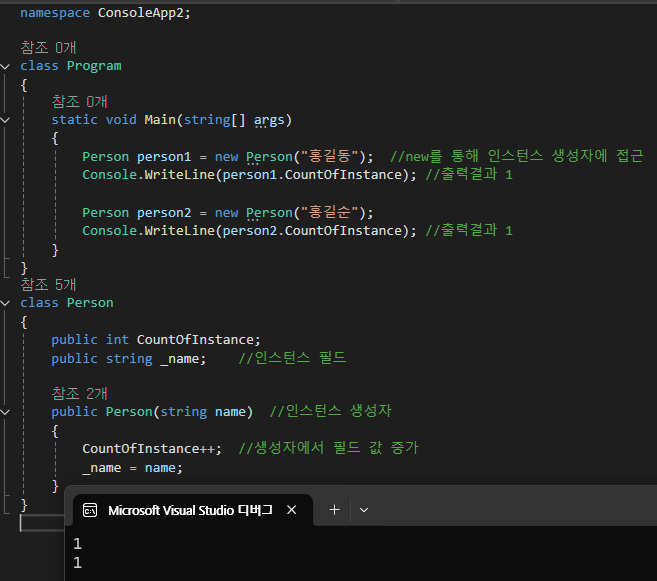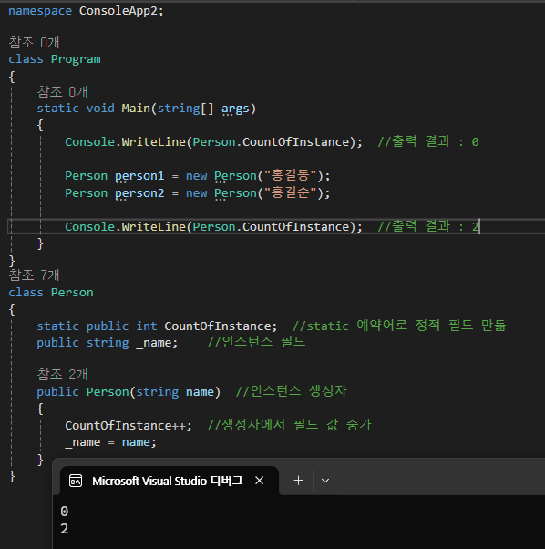 원하는 결과는 해당 클래스에 속한 인스턴스가 생성된 총 횟수를 나타내는 것으로, 마지막 값이 2가 되기를 바랬지만 원하는 값이 나오지 않았다. 인스턴스 필드는 new로 할당받은 객체마다 고유하게 메모리를 확보하기 때문에 클래스 전역적으로 값이 유지되지 않는다. 이 같은 요구 사항을 만족하려면 클래스 단위의 필드를 정의해야하고, 그것이 바로 정적 필드(static field)가 된다.