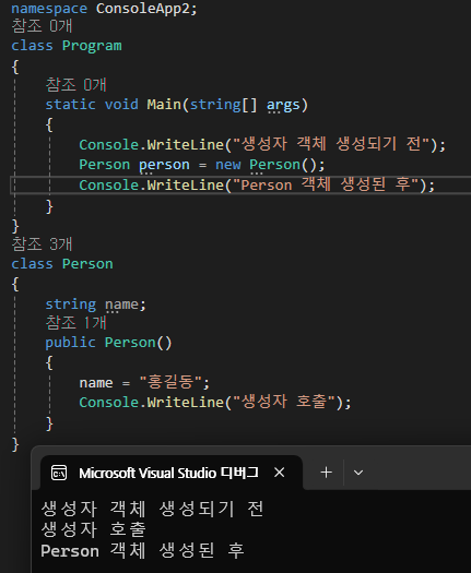 사실 모든 클래스는 생성자를 가지고 있다. 생성자를 명시적으로 정의하지 않았다면 C# 컴파일러는 일부러 다음과 같은 빈 생성자를 클래스에 집어넣고 컴파일한다.