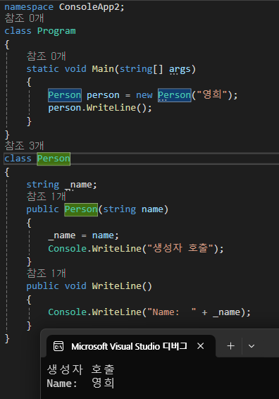 생성자는 전달받은 값을 멤버 변수인 _name에 보관해두고 이후에 클래스의 다른 멤버 메서드에서 사용한다.