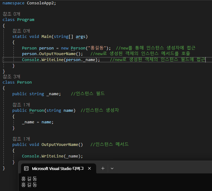 - 필드, 메서드, 생성자가 인스턴스 멤버라는 것을 강조하기 위해 때로는 인스턴스 필드, 인스턴스 메서드, 인스턴스 생성자라고도 표기한다.