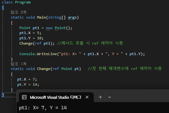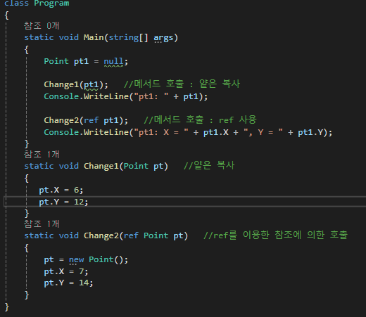 따라서 Change 메서드 내에서 vt의 변수 값을 변경하는 것은 원래의 v1 변수에 영향을 미치지 않는다. 반면 참조 형식을 메서드에 전달하는 경우를 예시로 든다.