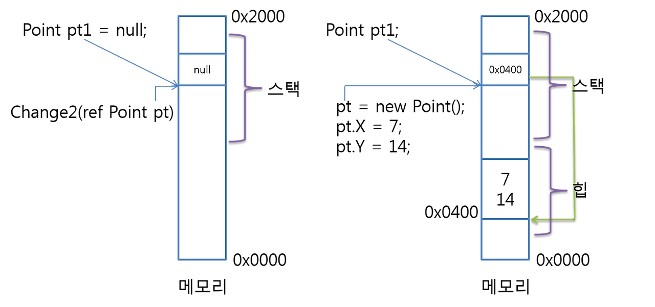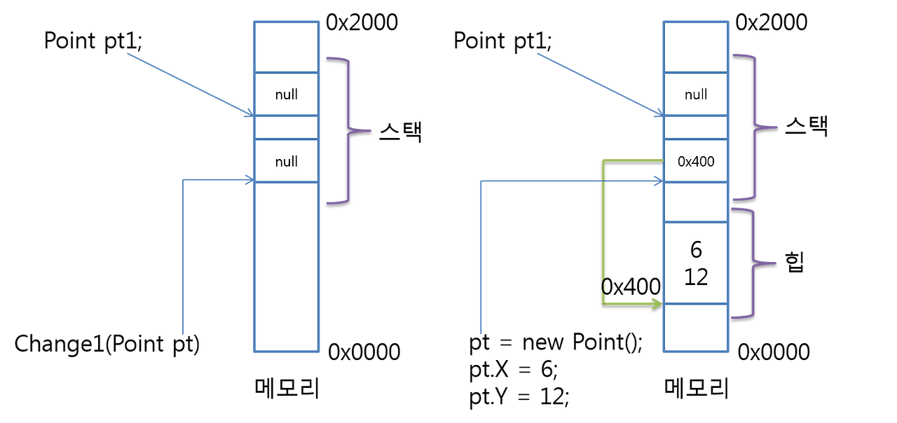 Change1의 메서드를 호출하면 참조 값이 또 다른 메모리에 복사되어 전달되므로 메서드 내에서의 new 메모리 할당이 원래의 pt1의 변수에 영향을 미치지 않는다.