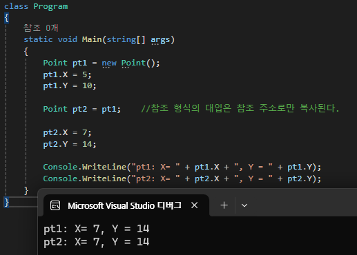 Vector 구조체는 값 형식이고, Point 클래스는 참조 형식이다. v1과 pt1이 대입된 v2, pt2의 변수 상태는 어떻게 변하는가?