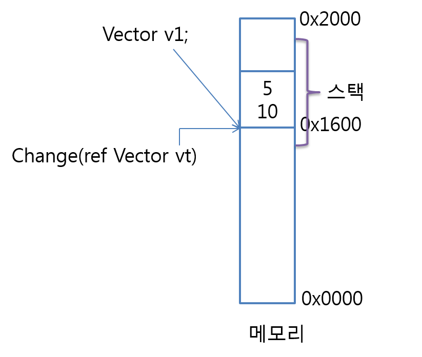ref를 사용하지 않았을 때는 전형적인 값 형식의 스택 복사가 있엇지만, 이를 사용하게 되면 메서드의 vt 변수가 호출 측의 v1 변수와 동일한 주소를 가리키게 된다