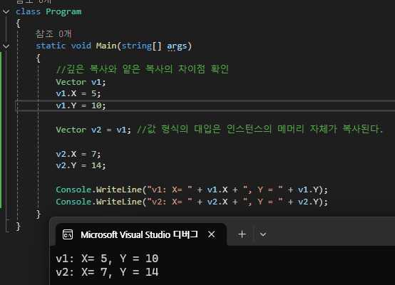 v1의 값을 v2에 대입하면 메모리상에서 깊은 복사가 일어나고 v2는 새로운 인스턴스를 가리키게 된다. 따라서 v2의 값을 바꿔도 그 변화가 v1과는 전혀 무관하게 이뤄진다. 하지만 얕은 복사가 일어나는 참조 형식은 이와 다른 결과를 낳는다.