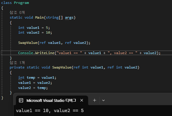 위의 SwapValue 메서드에서 ref 예약어를 빼면 내부에서만 값이 바뀔 뿐 외부의 변수에 대해서는 값이 바뀌지 않는다.