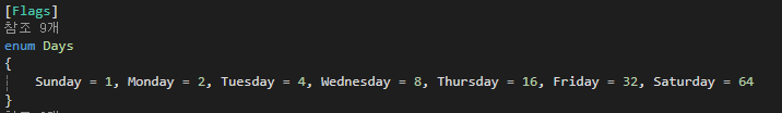 [Flags] 특성은 enum타입에만 사용될 수 있고 다음과 같이 타입 정의를 할때 함께 지정하면 된다.