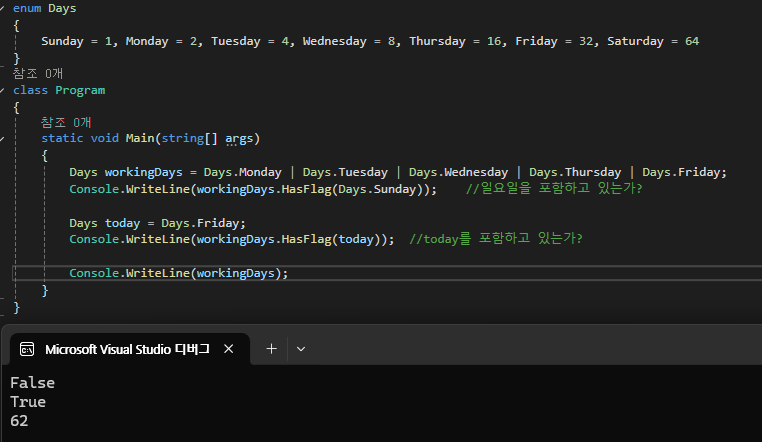 이렇게 정의하면 다음과 같이 |(OR) 연산자를 사용해 정수형 값을 겹칠 수 있고, HasFlag 메서드를 사용해 특정 요소 값을 포함하고 있는지도 판단할 수 있다.